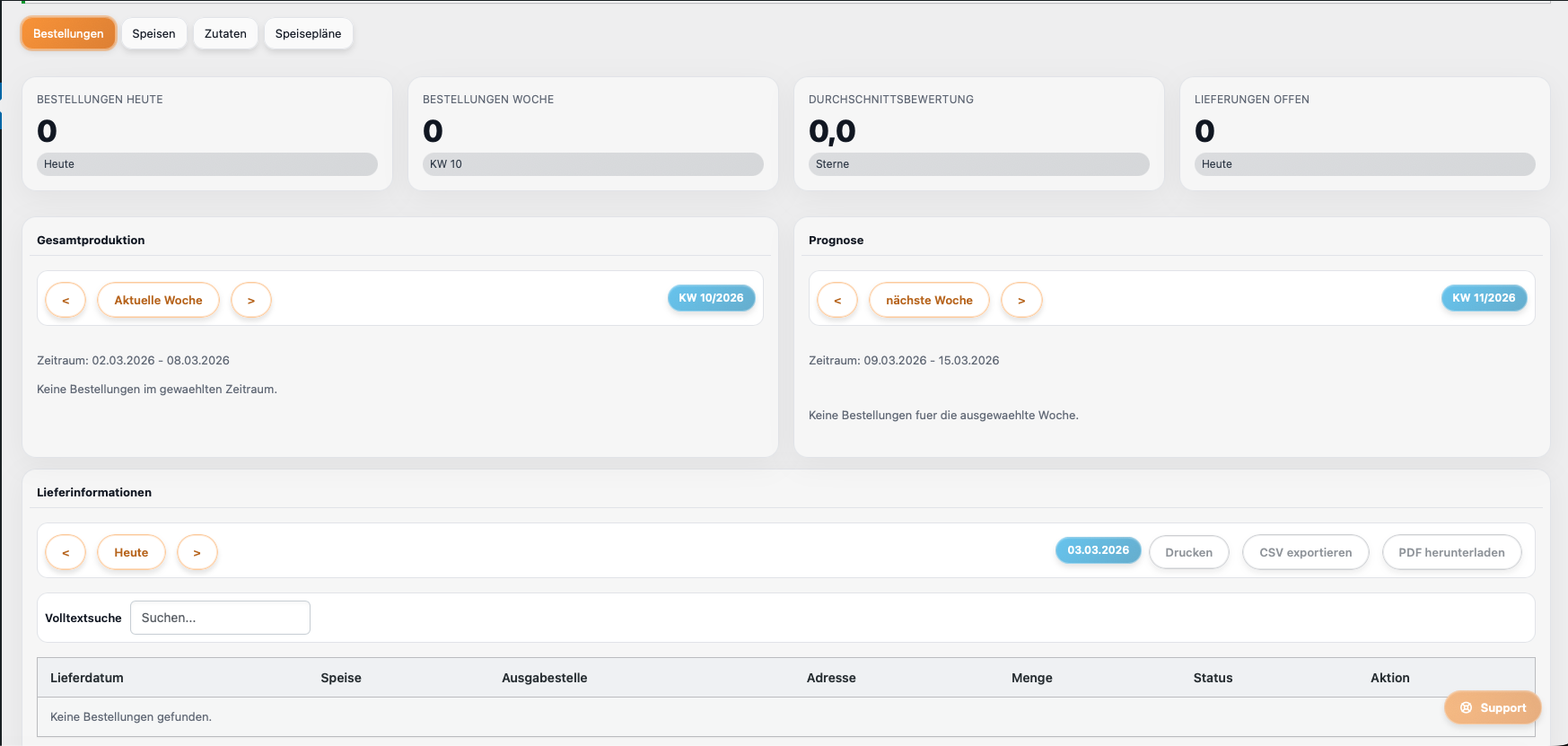 Verdichten Sie Mengen, Tagesnavigation und Produktionsprognosen im Küchen-Dashboard und behalten Sie offene Lieferungen und Prioritäten im Blick.